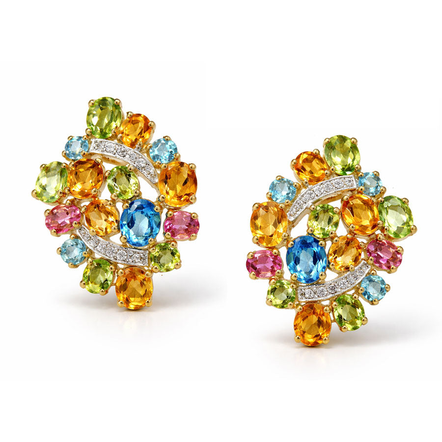 עגילי אבני חן ויהלומים עשויים זהב 14k,משובצים קוקטיל אבני חן ויהלומים במשקל 0.06 קראט, בצבע G ובניקיון SI