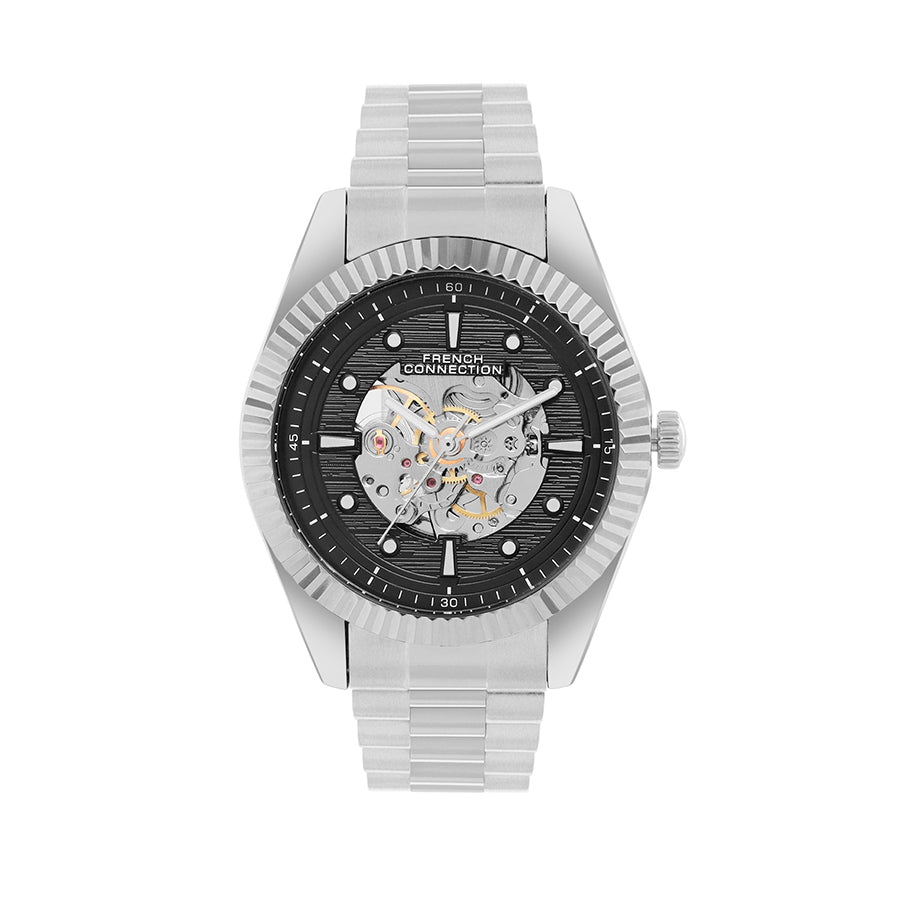 שעון אוטומטי מבית FRENCH CONNECTION בעיצוב אלגנטי עם מנגנון שלד גלוי בגב שקוף, גוף פלדת אל-חלד ורצועת מילנז נוחה ומתכווננת עם סגירה כפולה לבטיחות מלאה.