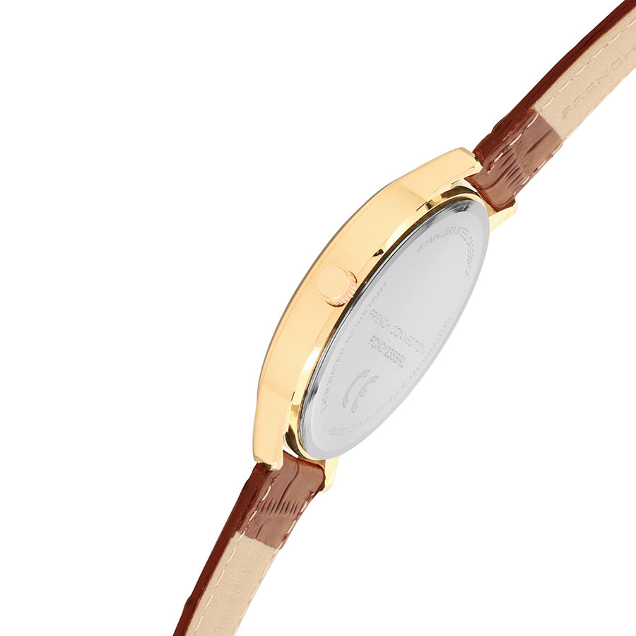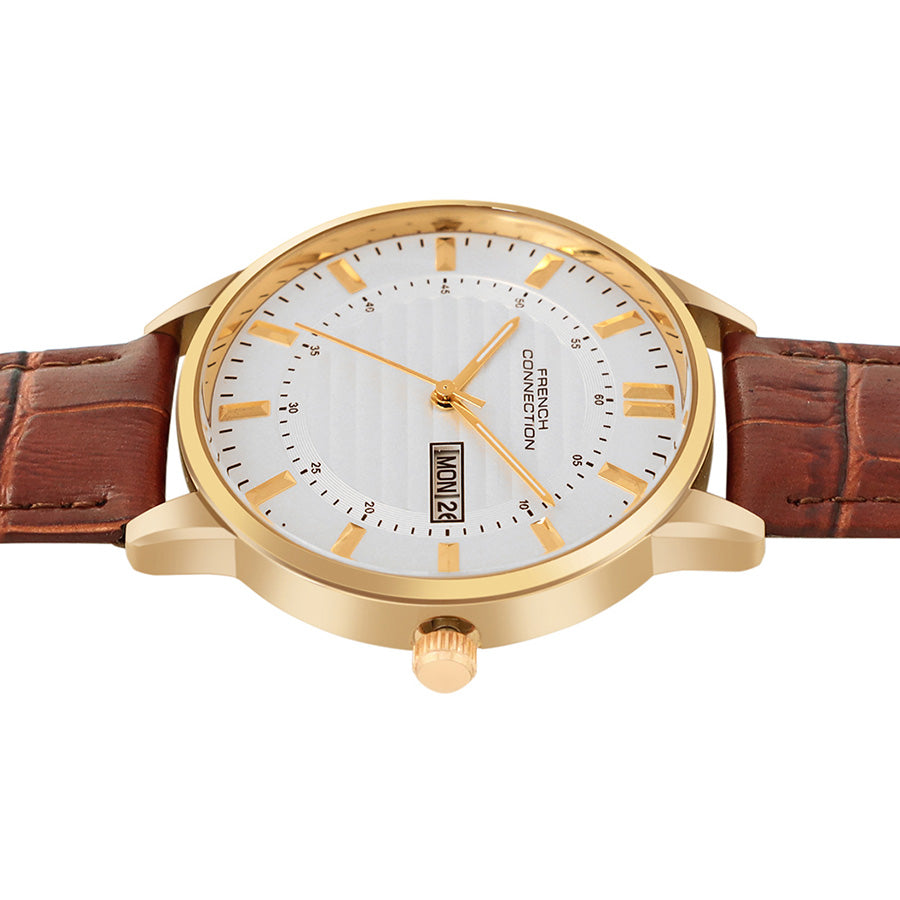 שעון לגבר מבית FRENCH CONNECTION עם לוח עגול כסוף במרקם וטקסטורה ורצועת עור חומה, דגם FCN0123SBRL