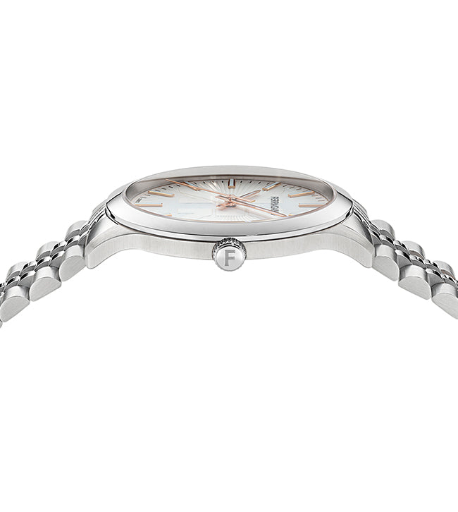 Ferragamo Duo — תחכום וסטייל במפגש מדויק, בשני גדלים שובת לב: 40 מ"מ עבורו ו-28 מ"מ, עדין יותר, עבורה. חוגת קרני השמש קורנת ביופי מרהיב