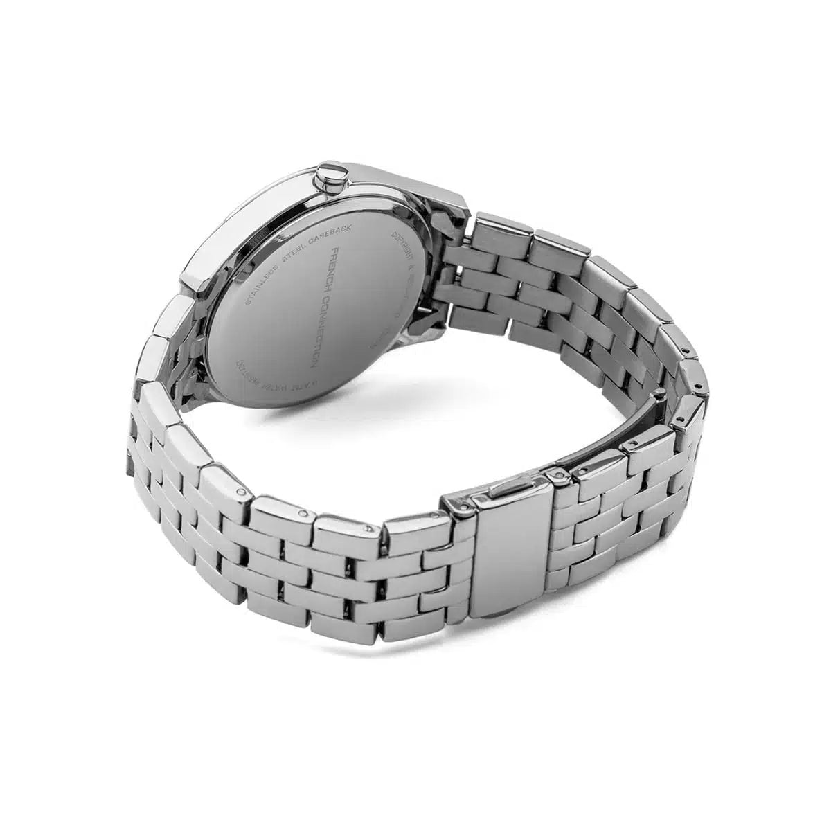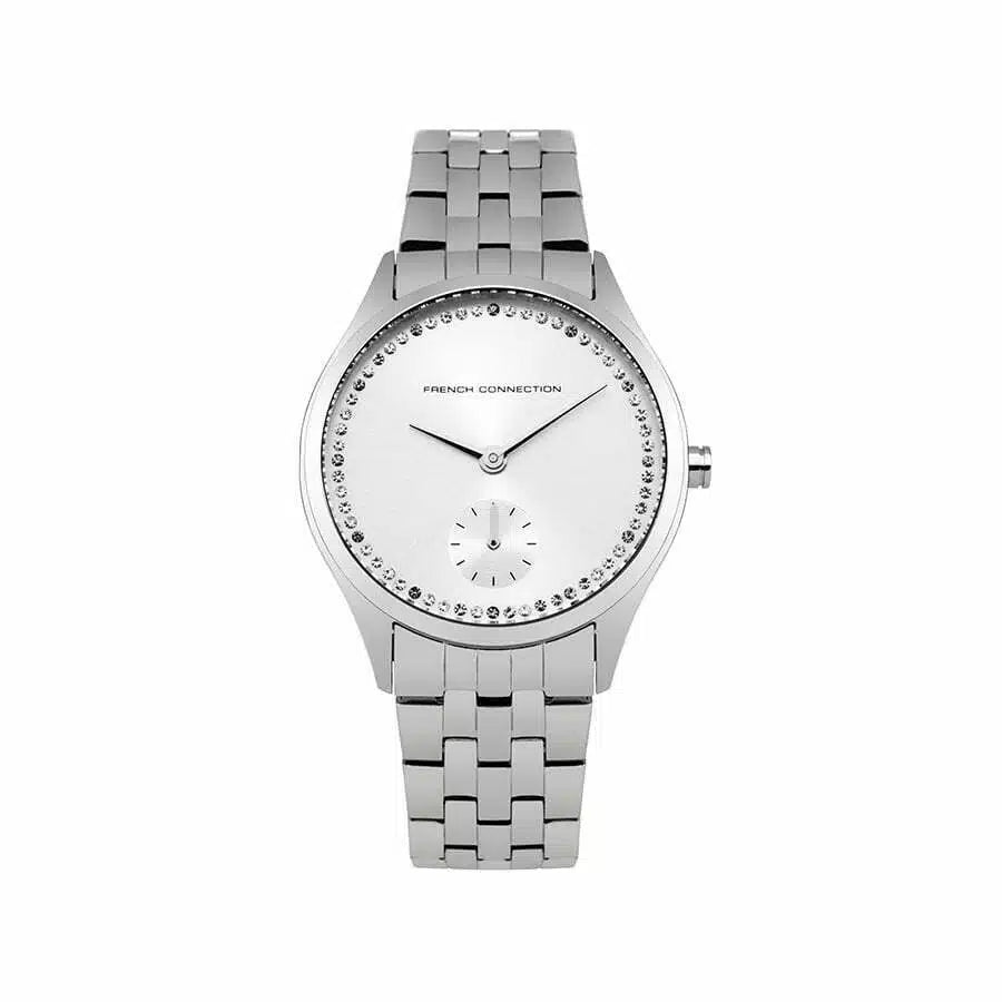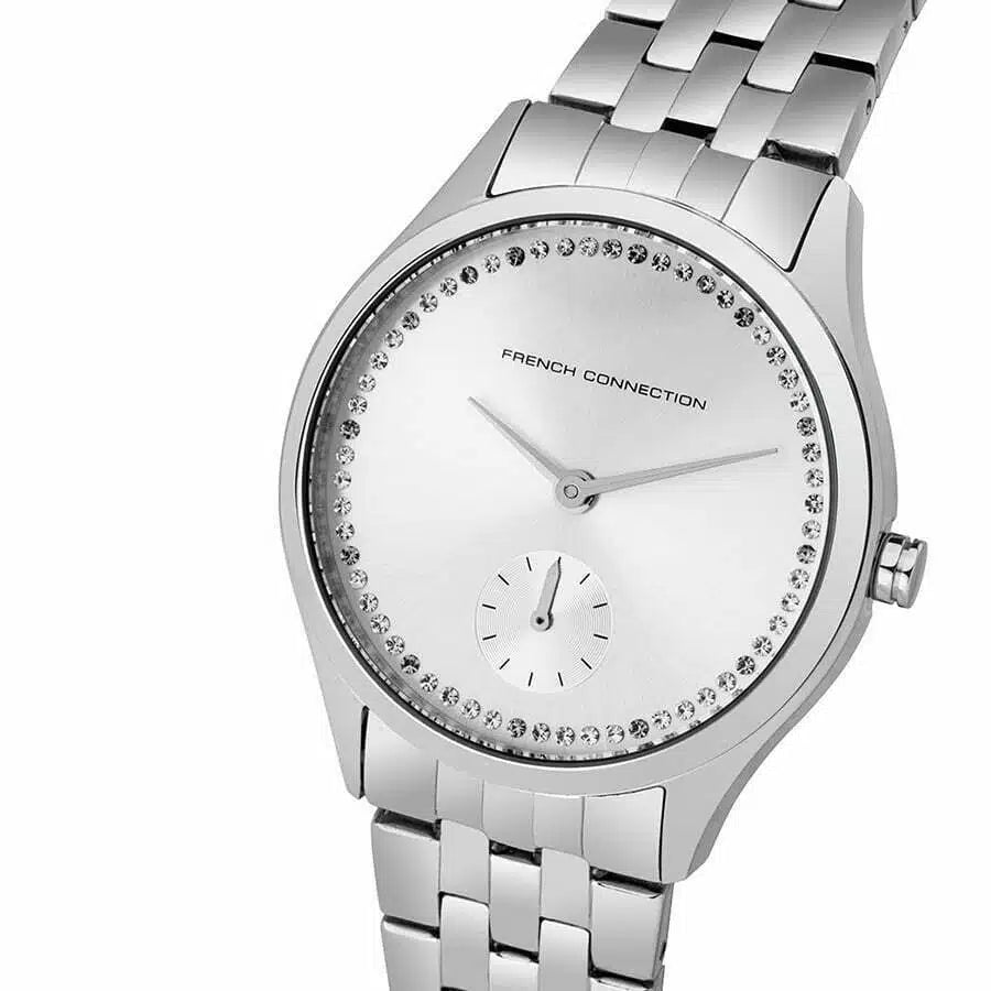 שעון FCUK לאישה מקולקציית Louisa משובץ קריסטלים עם רצועת סטיינלס סטיל בצבע כסוף ולוח כסוף