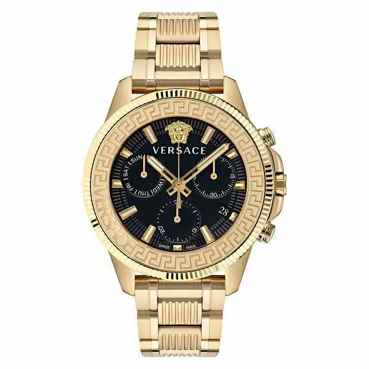 שעון Versace לגבר מקולקציית GRECA ACTION CHRONO ,דגם VE3J00622, הקופסה בגודל 45 מ”מ, לוח שחור מעוטר בסימן ראש המדוזה, השעון כולל תנועת כרונוגרף 3 ידיים, רצועת סטיילנס סטיל מוזהבת