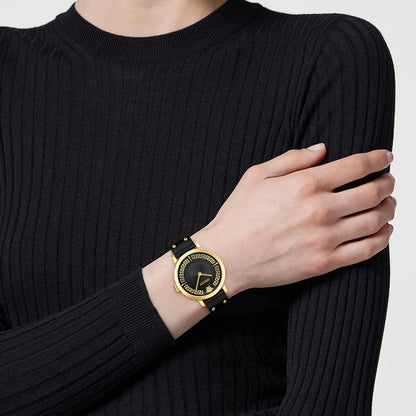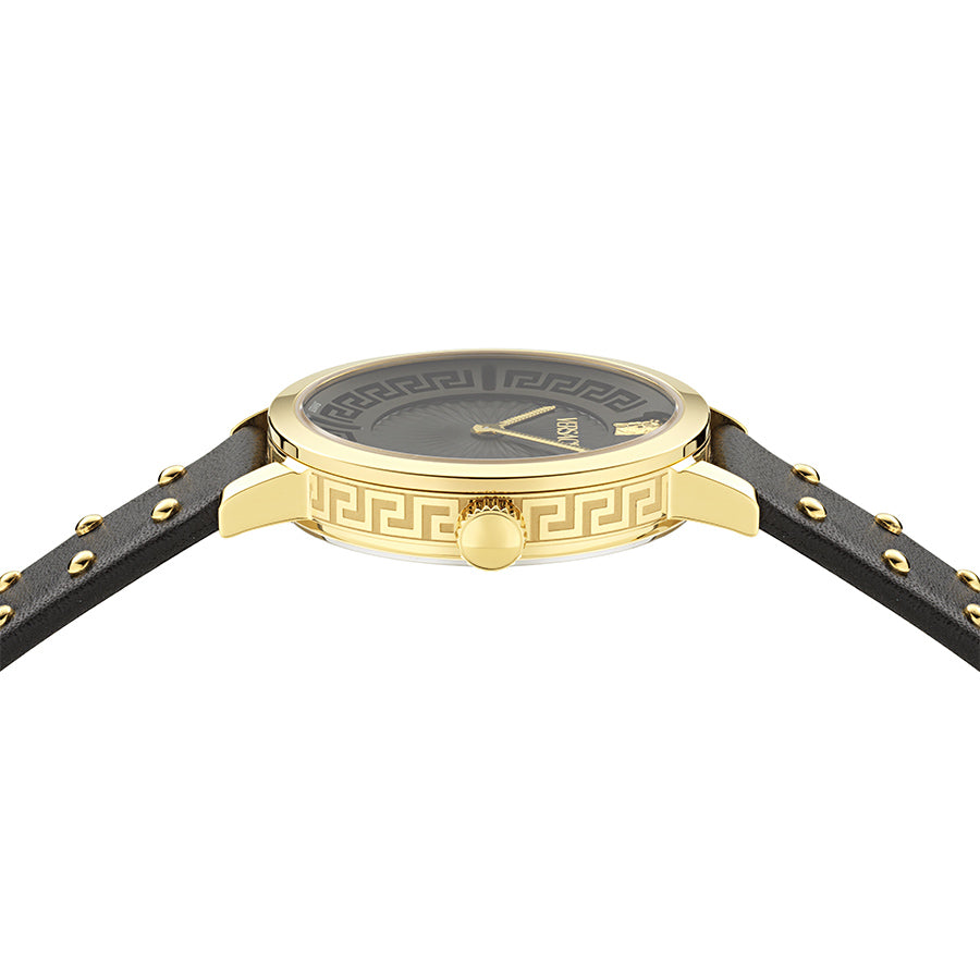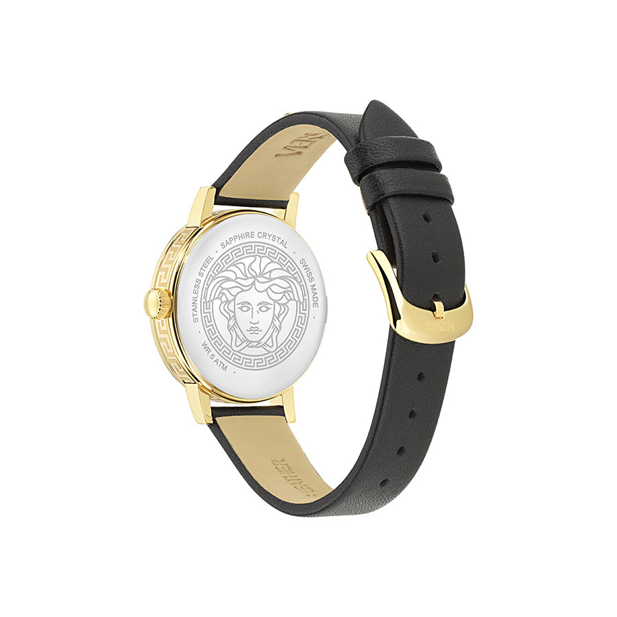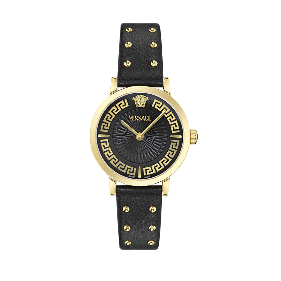 שעון Versace מקולקציית Greca Fortuna, הקופסה בגודל 35 מ"מ. מועשר עם ראש MEDUZA בשעה 12:00 ו- Greca מוזהב על הלוח.