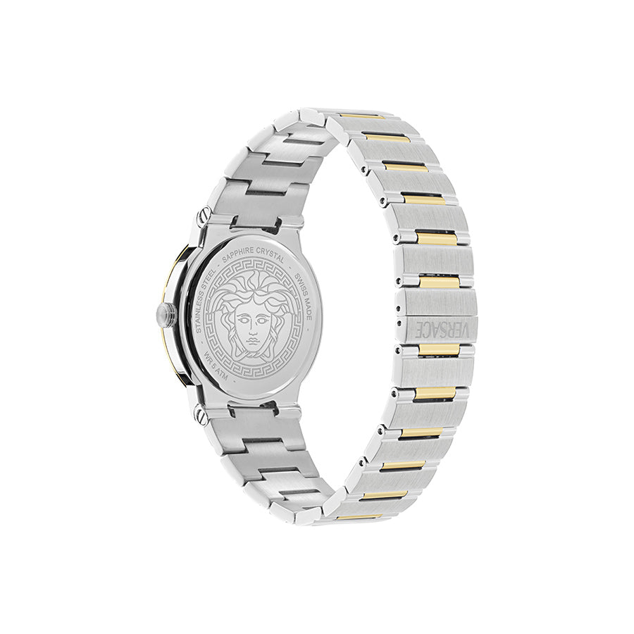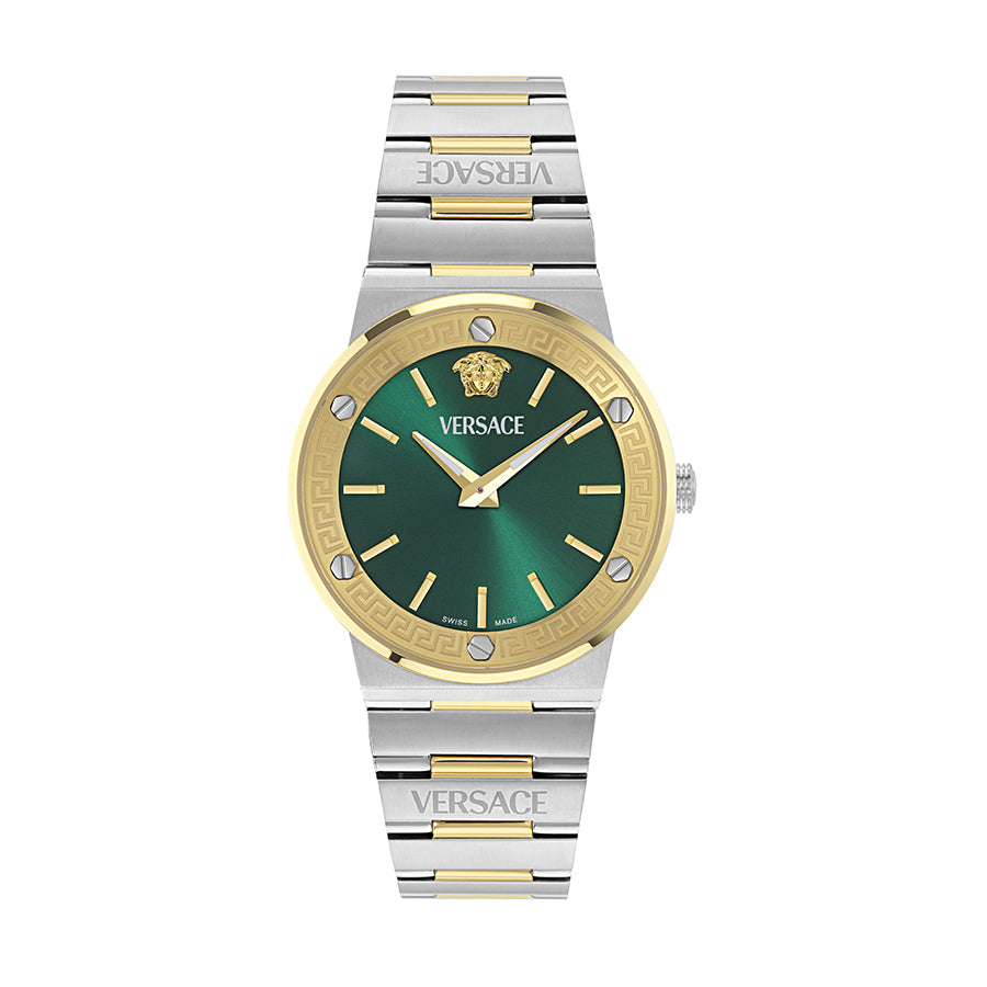 שעון Versace מקולקציית GRECA LOGO AERO במבנה Super-slim דק במיוחד של 38 מ"מ, המעוצב באלגנטיות מודרנית. לוח השעון בגימור Sunray לוכד את האור בצורה יפה, בעוד הטבעת העליונה כוללת ברגים דקורטיביים וחריטות של דוגמת ה-Greca, המוסיפים נגיעה של עידון נועז