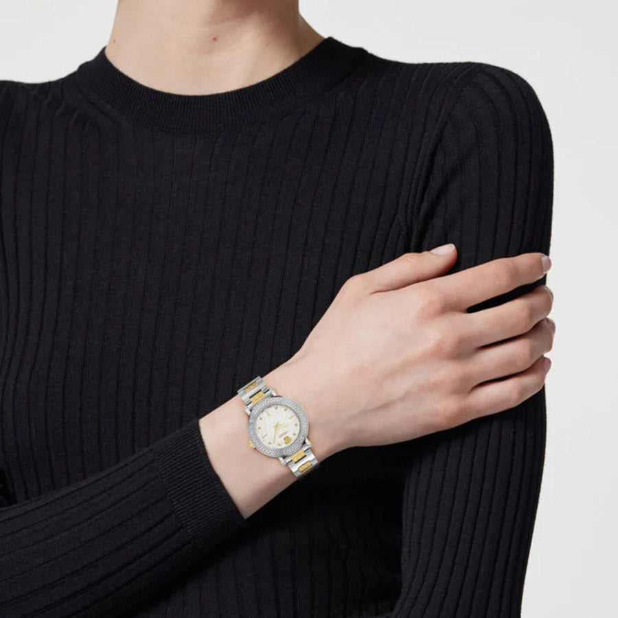 שעון Versace מקולקציית MILLENYIUM LADY, הקופסה בגודל 32 מ"מ. מועשר עם ראש MEDUZA בשעה 12:00, טבעת העליונה מקושטת עם מוטיב GRECA
