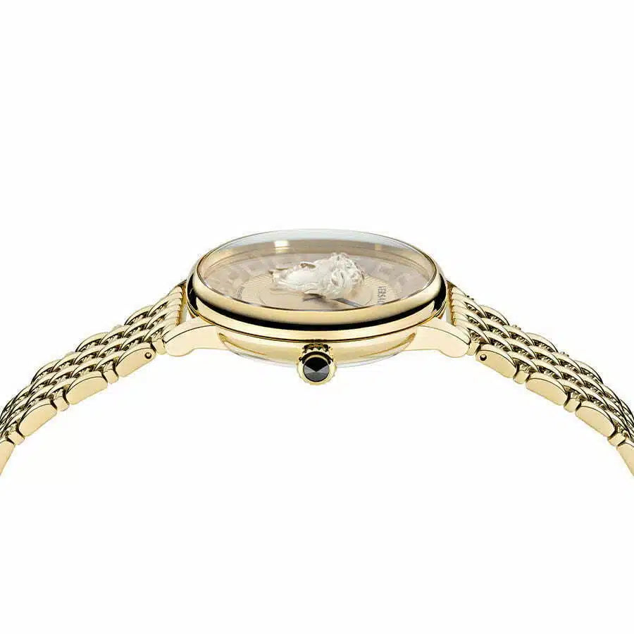 שעון Versace לאישה מקולקציית MEDUSA ALCHEMY, הקופסה בגודל 38 מ”מ לשעון הקלאסי הזה יש עיצוב איקוני חדש עם מדוזה שקופה תלת מימדית על החוגה מוזהבת, רצועת סטיילנס סטיל בצבע שמפניה